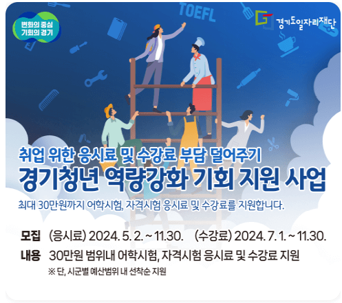 취업 청년들에게 취업의 부담을 덜어 주기 위해 정부에서 어학 및 자격시험 응시료를 지원하며, 청년들이 필요한 교육을 받을 수 있도록 수강료까지 지원하고 있습니다. 연간 최대 30만 원까지 지원하니 소진되기 전에 빨리 신청하셔서 혜택 받으세요.