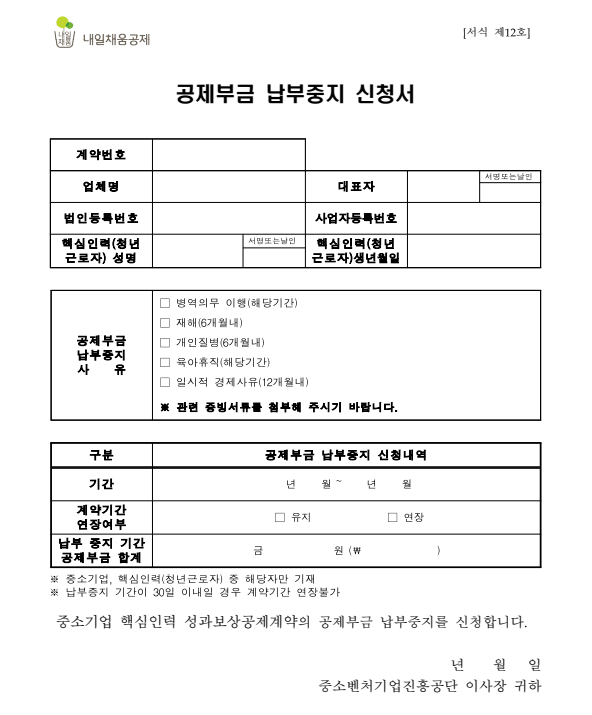 내일채움공제부금 납입 중지 신청서를 작성하셔서 관할 지역본 (지) 부를 직접 방문하여 신청할 수 있습니다.