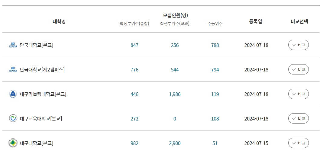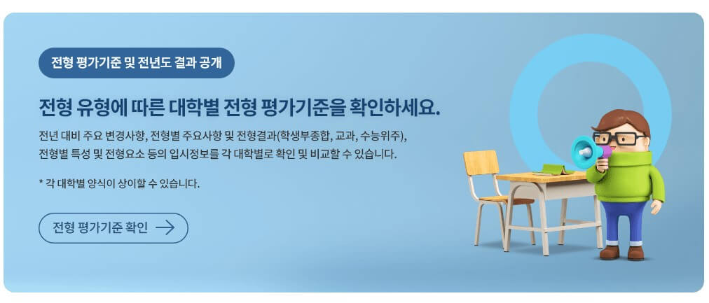 - 입학 전형 정보: 각 대학의 입학 전형에 대한 상세 정보를 제공하여, 수시 및 정시 전형에 대한 이해를 돕습니다.