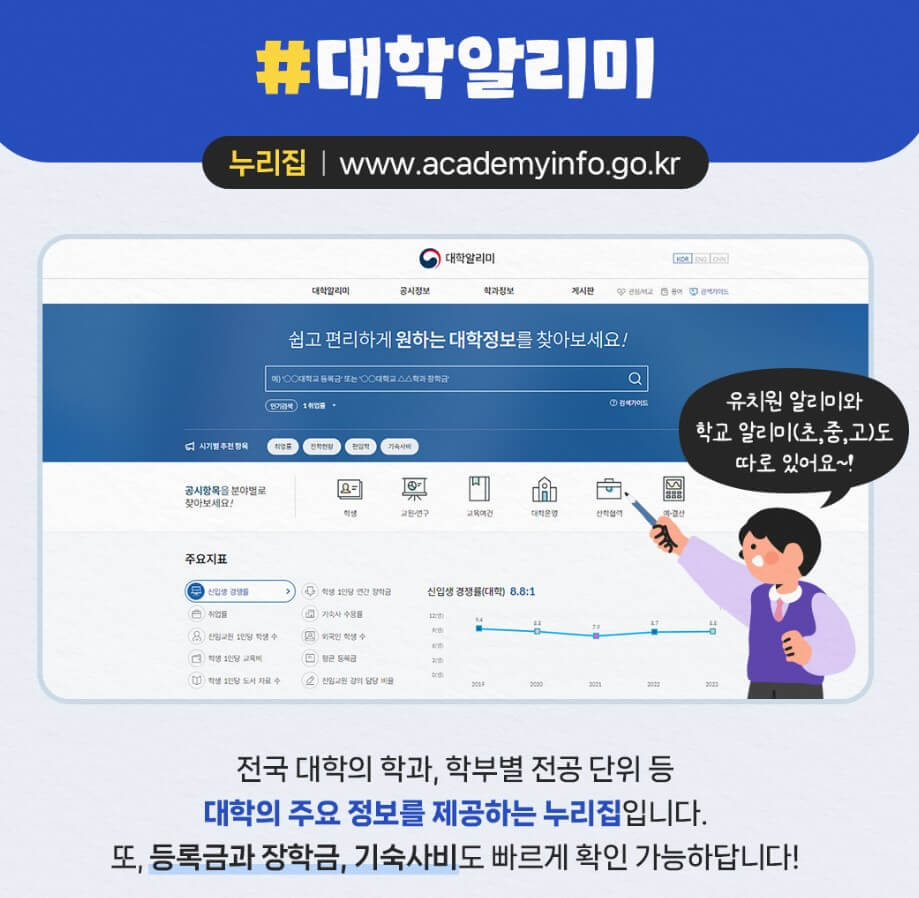 대학입시에 대한 정보를 찾고 계시나요? 대학입시에 관한 정보를 쉽게 찾고 활용할 수 있도록 돕는 대학알리미 사이트를 소개합니다. 한국의 고등학생과 학부모, 교육 관계자가 대학의 기본 정보, 학과 정보, 입학 전형, 학비, 졸업생 취업률 등 다양한 데이터를 모두 무료로 찾을 수 있으니 아래 링크로 접속하셔서 도움 받으시길 바랍니다.